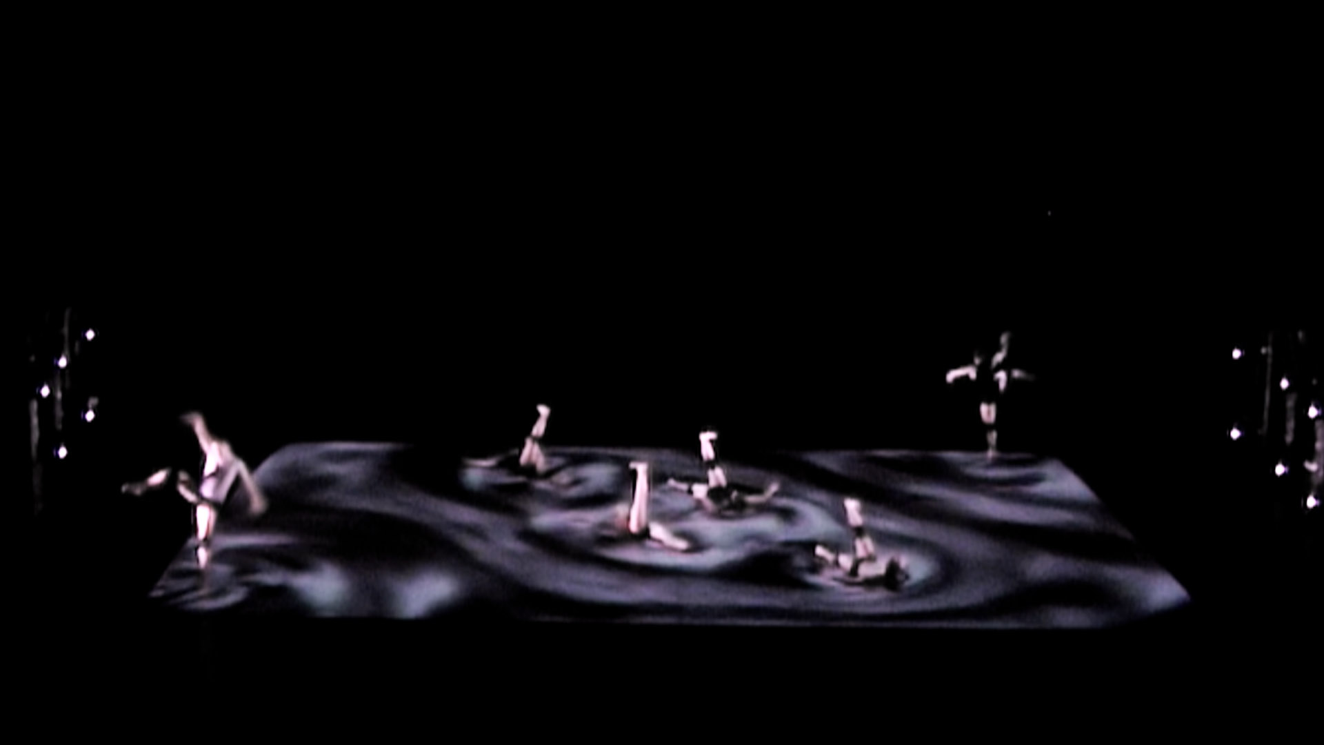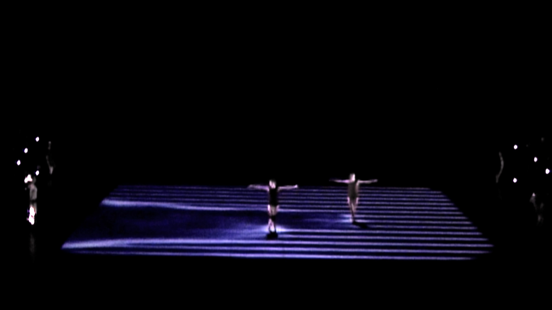 By their presence and movements, the dancers on stage affect a virtual, projected world underneath their feet. They are dancing inside of a scenery that reacts on every move that they make. Dancers and stage thereby form an inseparable unity. The floor becomes movable and participates in the event; stage and dancers no longer appear earth-bound.