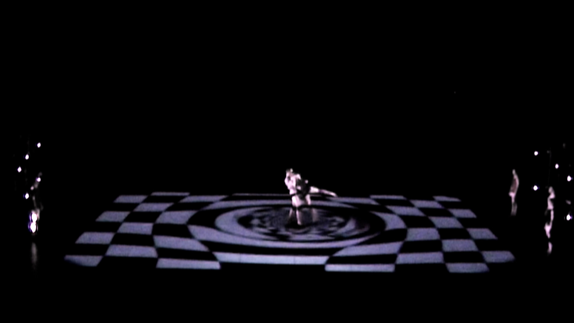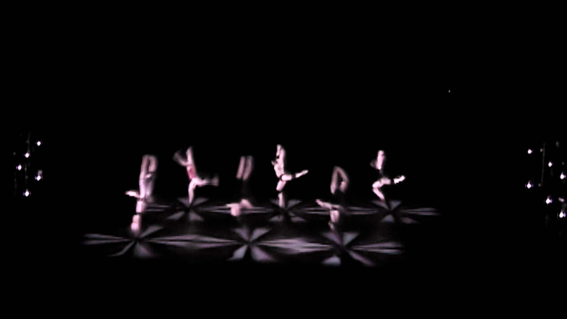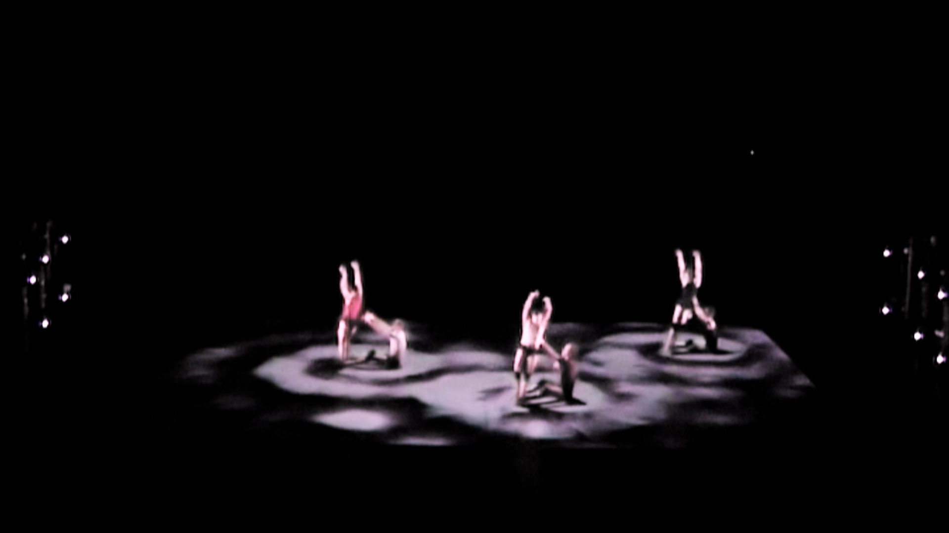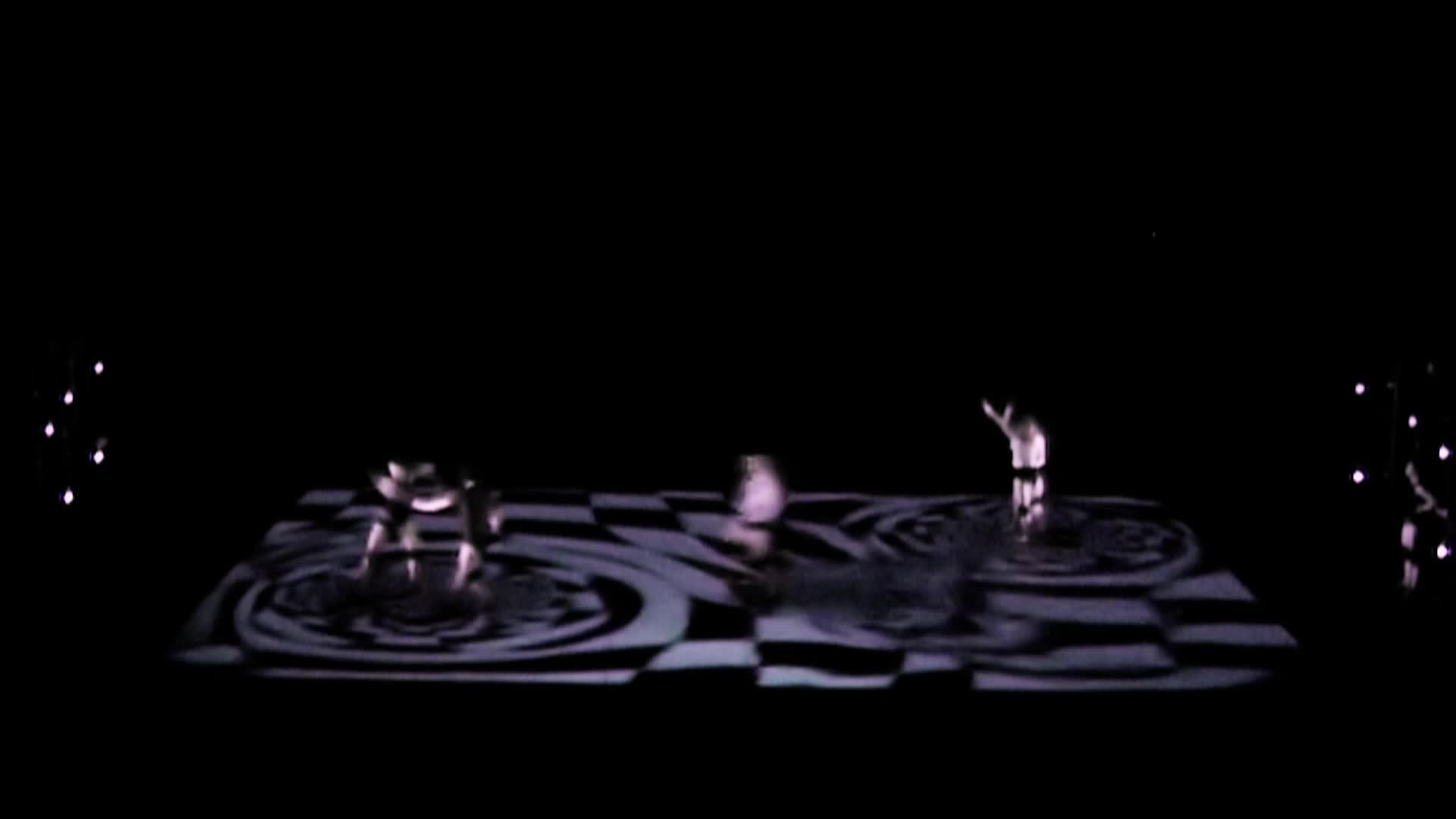 Technnically spoken, the dancers are captured by an infrared-sensitive camera above the stage and their movements are tracked by a computer. This information influences the mathematical parameters of several worlds reprojected on stage. Among the virtual worlds, some are based on physics, like a wind channel or some kind of a liquid, while others are completely artificial by nature.