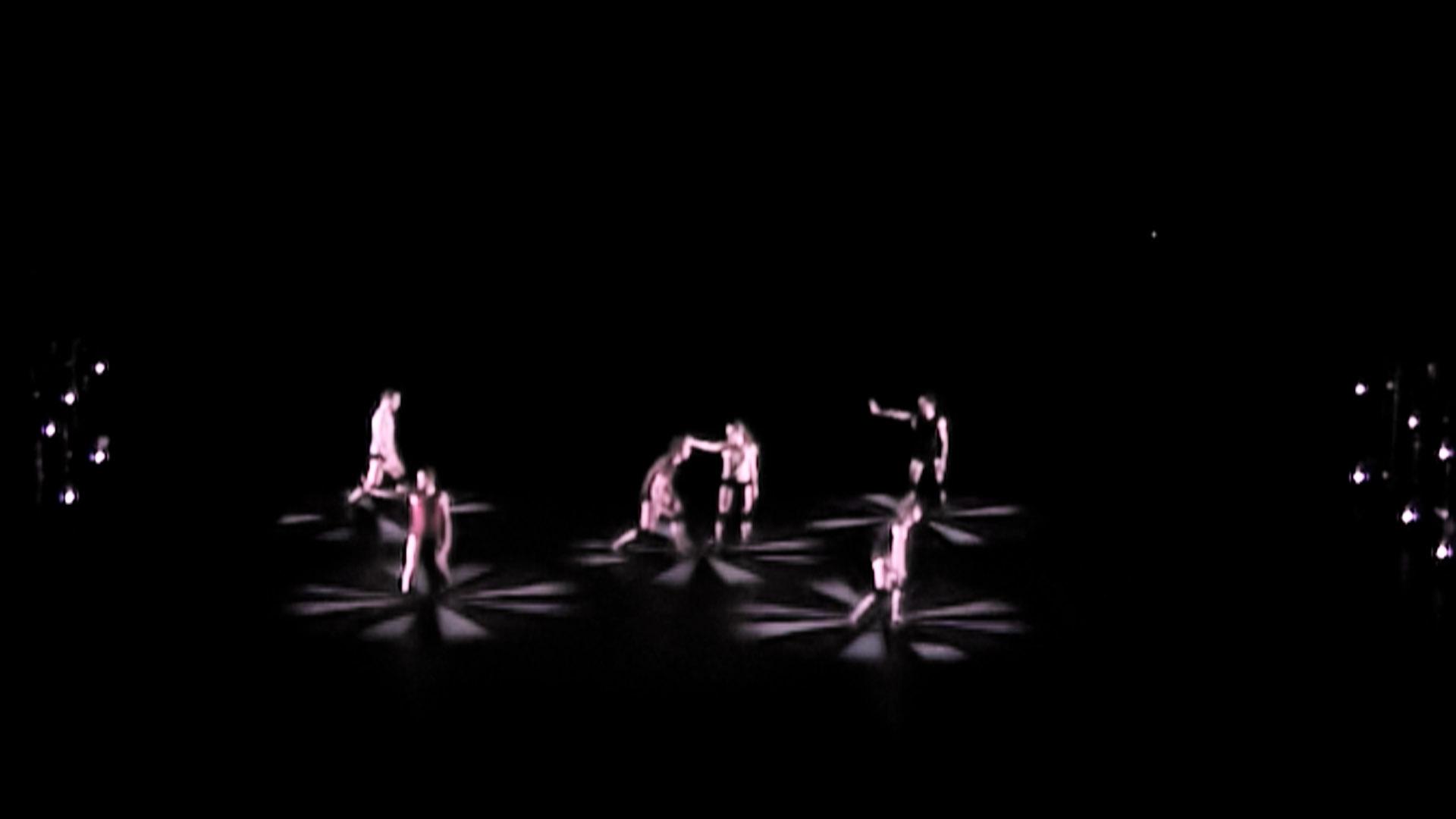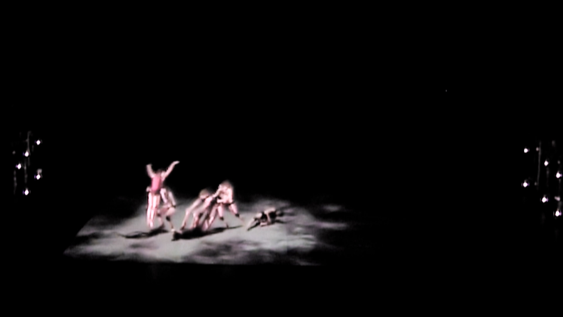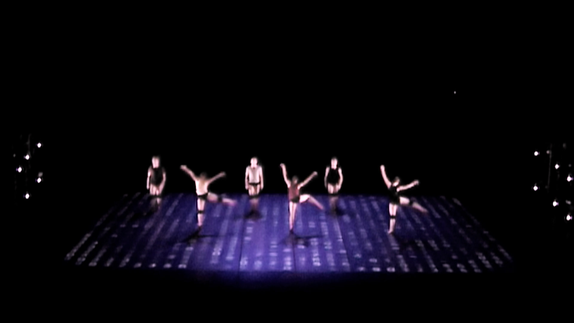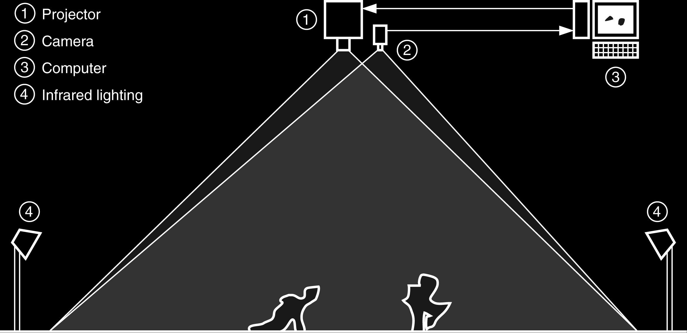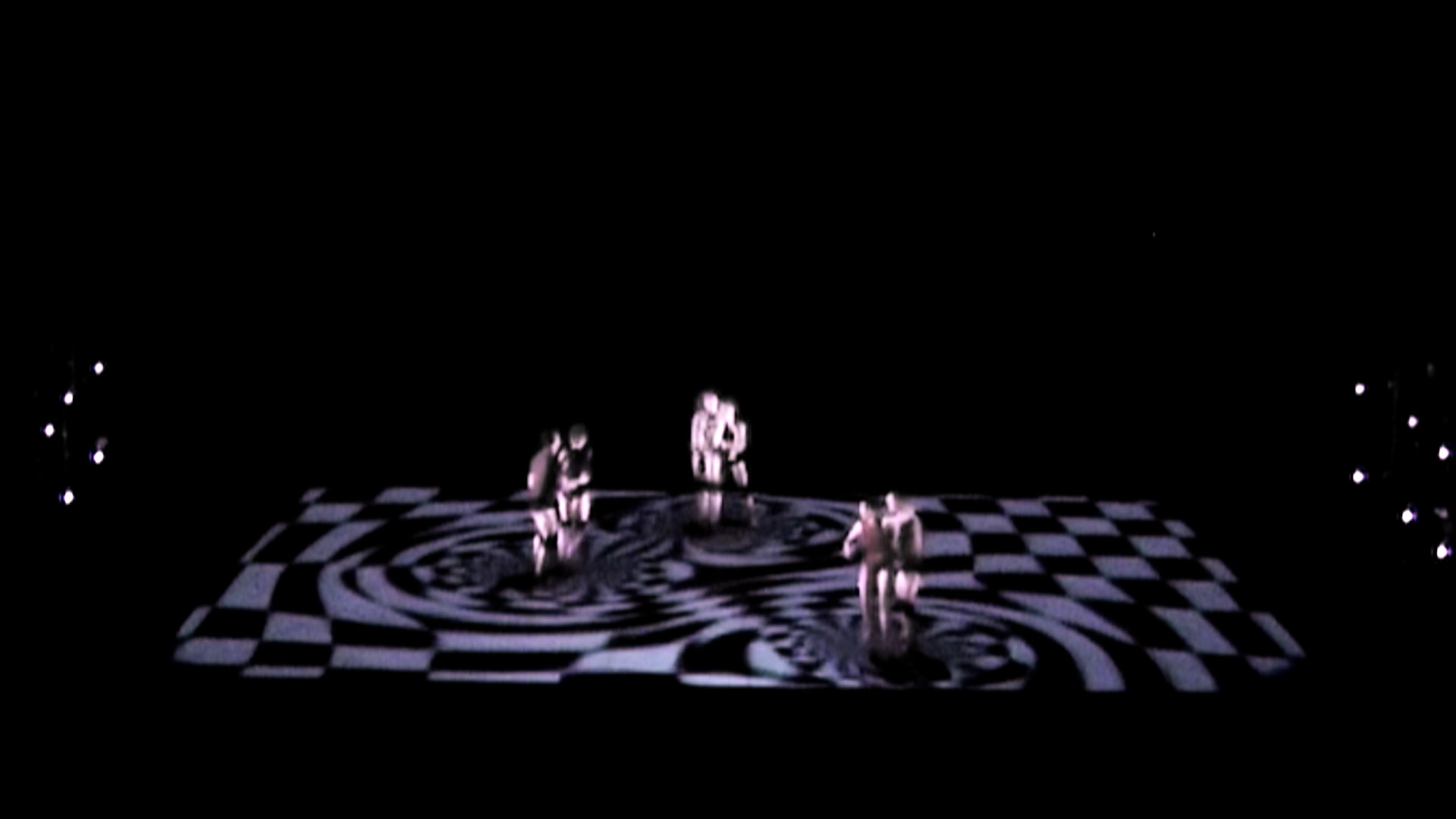 Technnically spoken, the dancers are captured by an infrared-sensitive camera above the stage and their movements are tracked by a computer. This information influences the mathematical parameters of several worlds reprojected on stage. Among the virtual worlds, some are based on physics, like a wind channel or some kind of a liquid, while others are completely artificial by nature.